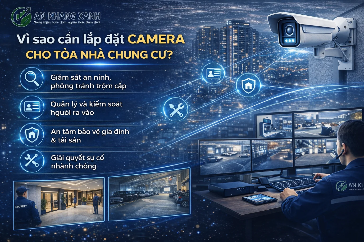 Bài viết cung cấp cái nhìn toàn diện về giải pháp an ninh tòa nhà, chung cư trong bối cảnh đô thị hiện đại. Trọng tâm là lắp đặt camera với các giải pháp tối ưu cho tòa nhà chung cư, căn hộ và gia đình, giúp nâng cao an toàn, quản lý hiệu quả và bảo vệ tài sản. Nội dung phân tích chi tiết vai trò của camera trong từng khu vực như cổng ra vào, sảnh, hành lang, thang máy, hầm xe cũng như xu hướng camera AI thông minh. Đồng thời, bài viết giới thiệu Công Ty TNHH Giải Pháp Công Nghệ An Khang Xanh – đơn vị uy tín trong tư vấn, thi công và bảo trì hệ thống camera chuyên nghiệp, mang lại sự an tâm và giá trị bền vững cho mọi công trình.